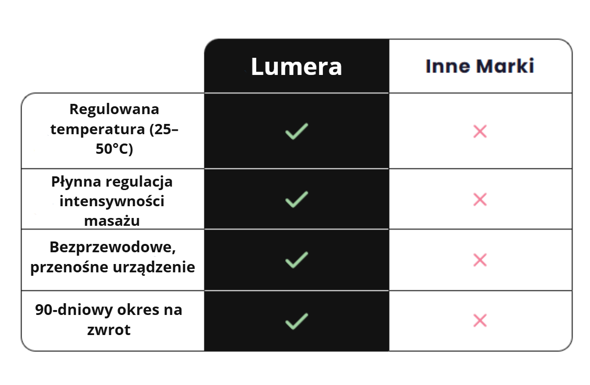 Połączenie delikatnych wibracji z funkcją podgrzewania pomaga pobudzić krążenie krwi i wspiera lepsze dotlenienie tkanek. Lepsze krążenie oznacza szybszą regenerację, większe odprężenie mięśni oraz ogólną poprawę samopoczucia. Masaż Lumera to idealne rozwiązanie po długim dniu pracy, treningu lub długim siedzeniu.